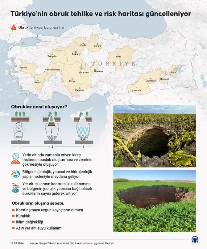 Konya Teknik Üniversitesi Obruk Araştırma ve Uygulama Merkezi Müdürü Prof. Dr. Fetullah Arık, obruk tehlikesi bulunan il sayısını geçen yıl AFAD'la birlikte 16 olarak belirlediklerini ifade ederek, "Bu illerin büyük çoğunluğunda da bu yıl obruklar görüldü." açıklamasında bulundu.